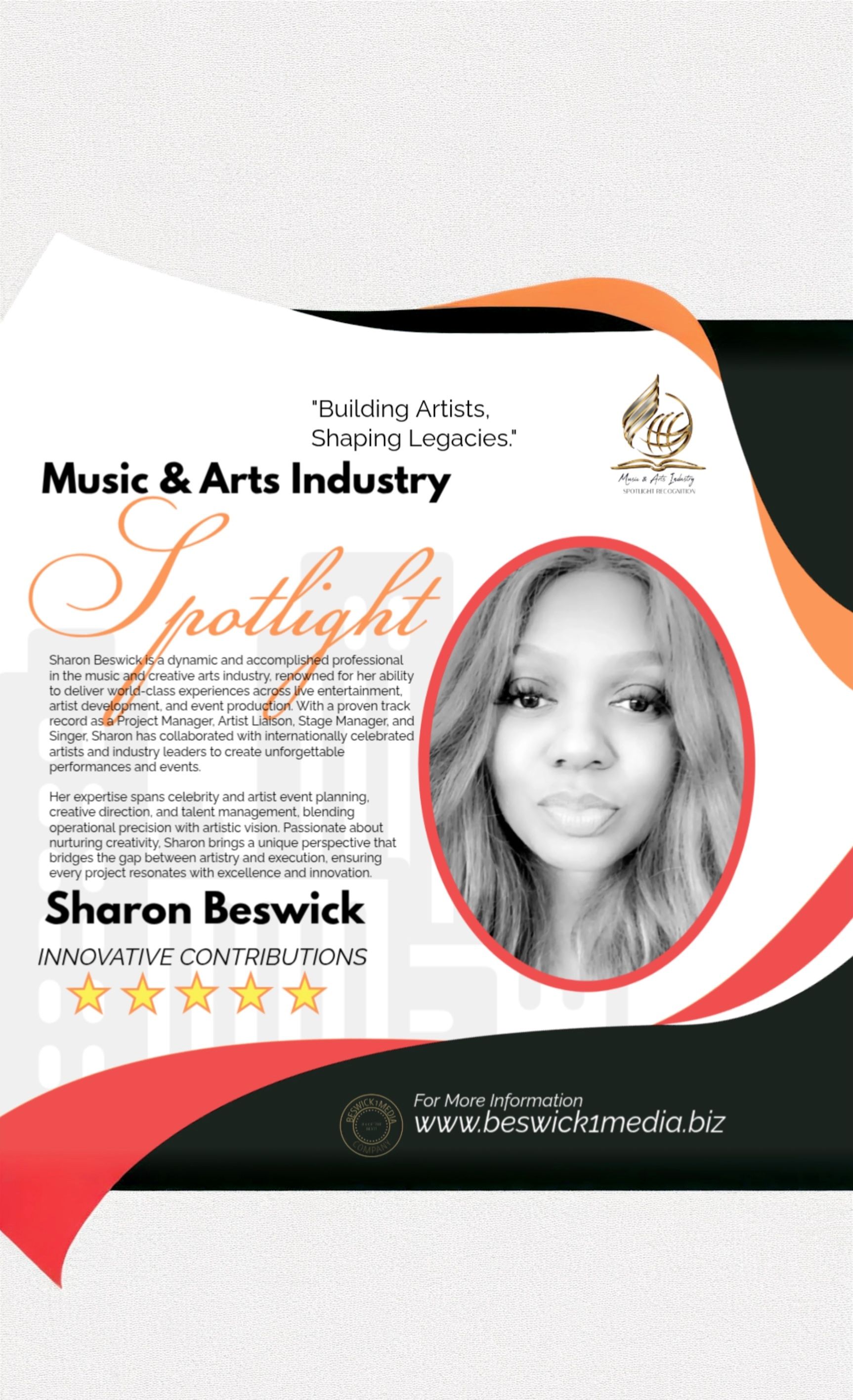 Sharon Beswick has been honored with the Innovative Contribution Award for her outstanding work in the music industry. Known for transforming creative artistry into strategic success, Sharon has built a reputation as a visionary leader—bridging performance, production, and business growth. Her expertise spans artist development, event management, and digital innovation, making her a driving force behind impactful music experiences. This award celebrates Sharon’s commitment to elevating talent and shaping the future of music through bold ideas and groundbreaking initiatives.